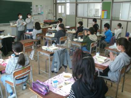 (今日の献立) さごしのおろし醤油かけ 里芋のすまし汁 大豆の煮物 ごはん 牛乳