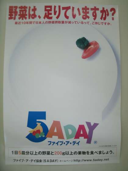 「ファイブ・ア・デイ」とは、「1日5皿(350g)以上の野菜と200gの果物を食べよう」をスローガンとする健康増進運動です。