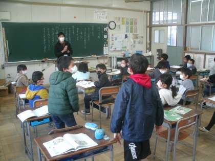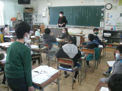 道徳科学習の様子です。教材文「雨ととの様」を読んで、きまりについて考えます。