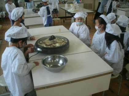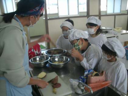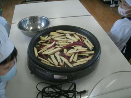 みんなで家庭科室に集合です。少し前に収穫したサツマイモを使って「おいもスティック」を作っています。サツマイモを切るのは難しいので、担任の尾崎先生が切ってくださいました。