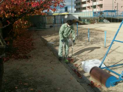 ところが、私たちの目を楽しませてくれたサクラは落葉樹です。これが厄介なんです。山であれば腐葉土となり、山の栄養として樹木を育てますが、学校は運動場です。落ち葉は困ります。そこで、管理作業員の畠山さんがいつも掃除をして集めてくださっています。