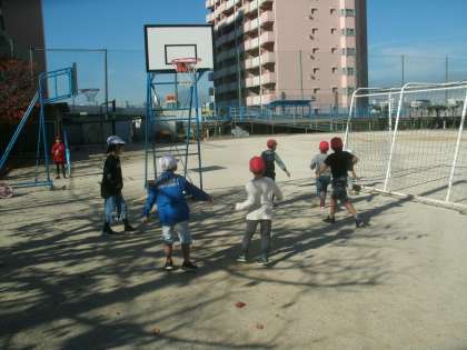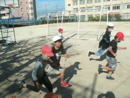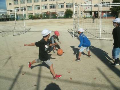 15分休みに4年生と2年生が一緒にバスケットボールをして楽しんでいました。