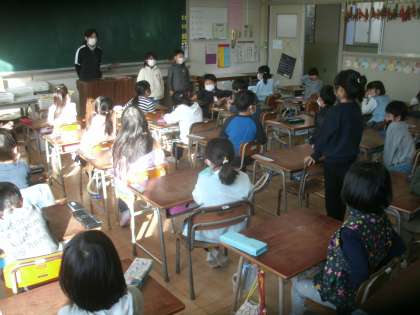 朝の会で日直がスピーチをしています。お友だちの質問にも答えています。