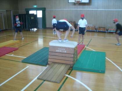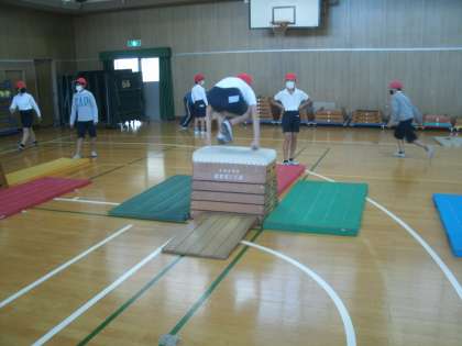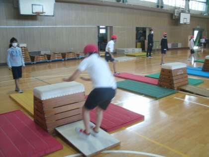 体育科学習の様子です。開脚跳びの後、かかえこみ跳び(昔で言う閉脚跳び)に挑戦していました。