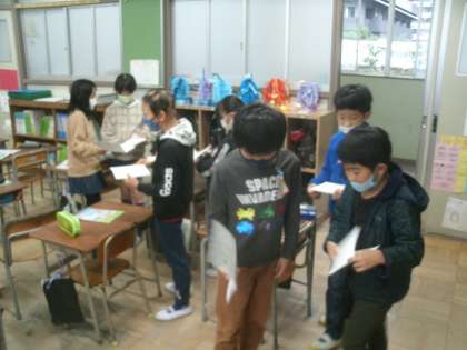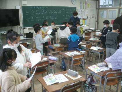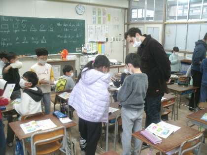 英語活動の様子です。手作りのクリスマスカードを交換しています。