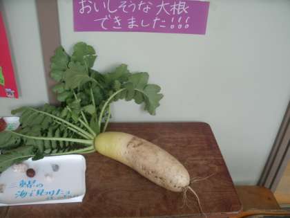 午後から教室を回っているとこんな立派なダイコンが展示されていました。野菜部が育てていたダイコンです。試し掘りをしたらこんな見事な大根が出てきたそうです。