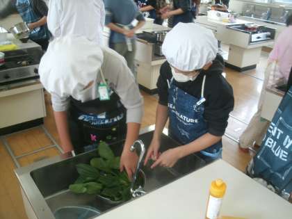 家庭科学習の様子です。初めての「調理実習」に取り組みました。「青菜のおひたし」と「ゆでたまご」に挑戦です。