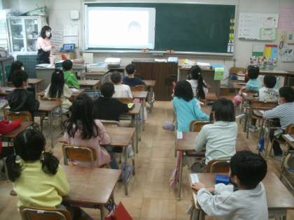 水曜日の朝の時間、1・2年生は英語活動を楽しみます。