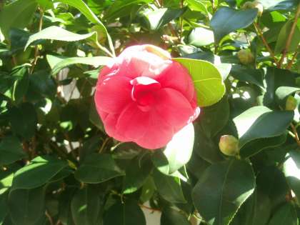 給食室東側に植えてあるツバキが一輪咲いていました。