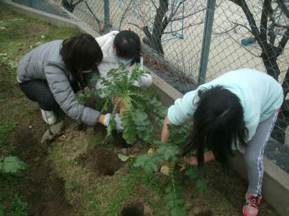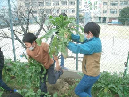野菜部(4年生)の大根を収穫する様子です。とても立派な大根が収穫できました。大根は2種類。少し太くて短い大根もありますよ。