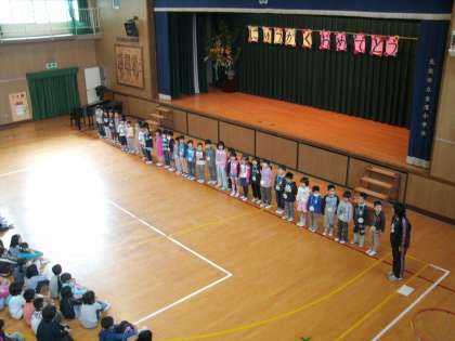 今年、金塚小学校に仲間入りした35人の1年生の入学を祝う会が児童会主催で行われました。初めて見る「金塚レンジャー」に1年生の子どもたちもびっくり。楽しくゲームをしたり、1年生からのお礼のことばがあったり、とても温かい雰囲気に包まれた、ほのぼのとした集会になりました。