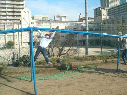 猛練習の証であるまめがたくさん手の平にありました。すごいですね。ぶら下がったままで最初から最後まで行けるんです。一本抜かしもできるんですよ。