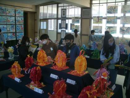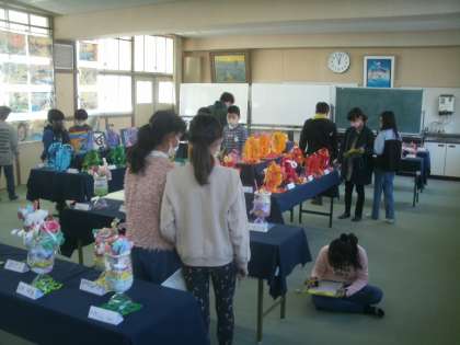 多目的室で他学年の作品を鑑賞しています。印象に残った作品を見つけ、その作品のどこが良かったのかをワークシートに記入しています。