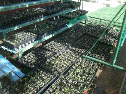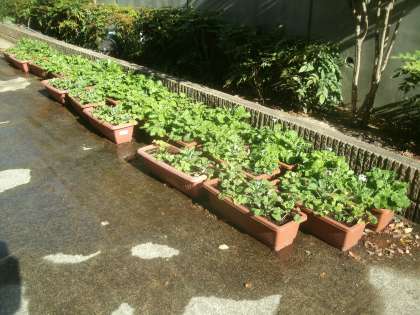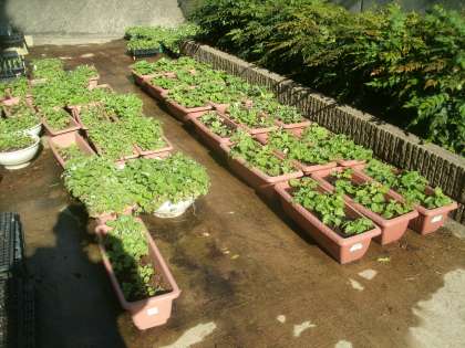 サクラソウとパンジー・ビオラがバックヤードで出番を待っています。