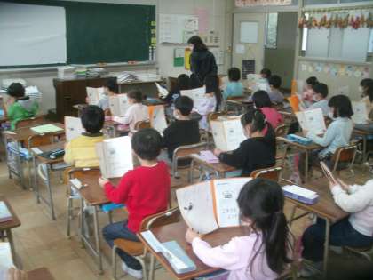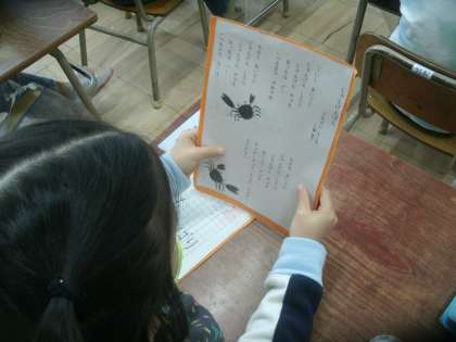 みんなで「じゃんけんぽん」を音読していました。さわがにがじゃんけんをする面白さを書いた詩を音読しています。