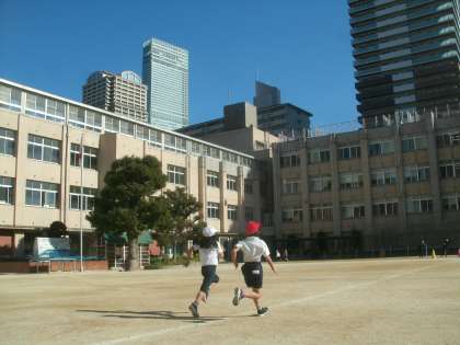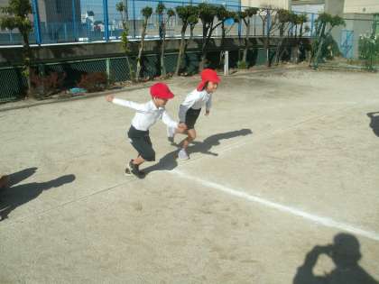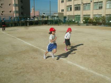 素晴らしい青空の下、1年生の子ども達が一生懸命走っています。