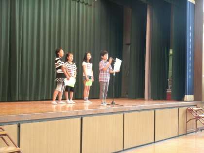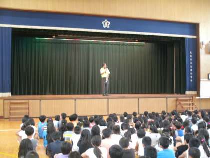 1学期の終業式。校長先生のお話、5年生による「1学期をふりかえって」の発表、夏休みの生活についてのお話がありました。心も体も大切にして、楽しい夏休みを!