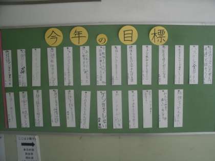 4年生の子ども達の「今年の目標」が廊下の掲示板に貼り出されていました。一人一人がしっかりと具体的に目標を持ってくれたようで、とても嬉しく思いました。