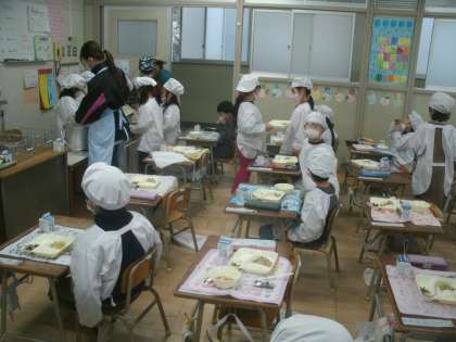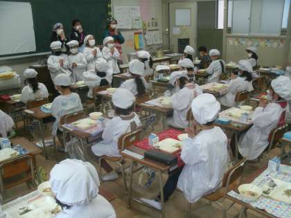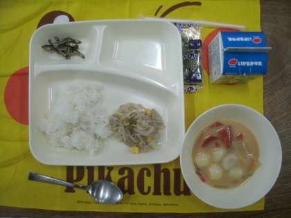 (今日の献立) れんこんのちらし寿司 ぞうに ごまめ きざみのり 牛乳