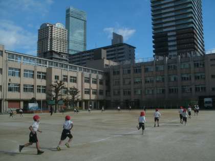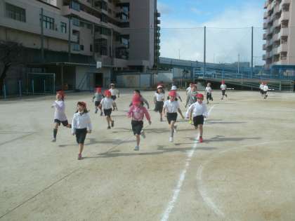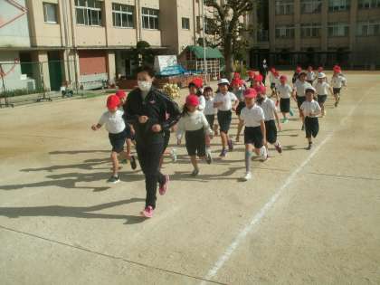 体育科学習の様子です。「3分間走」に取り組んでいました。最初の1周はみんなでゆっくり走ります。2周目からは自分のペースで3分間走ることになっています。
