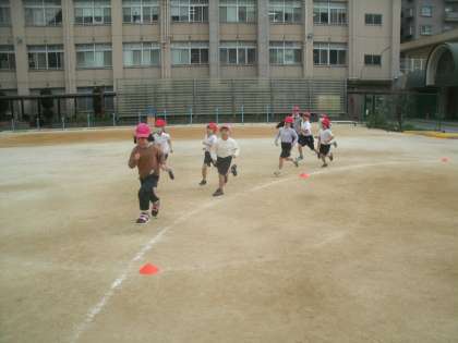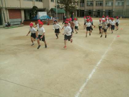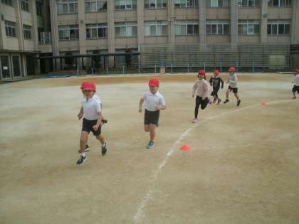 体育科学習の様子です。2年生の子ども達が「5分間走」に取り組んでいました。自分のペースで走り続けます。