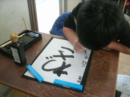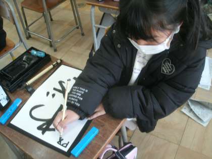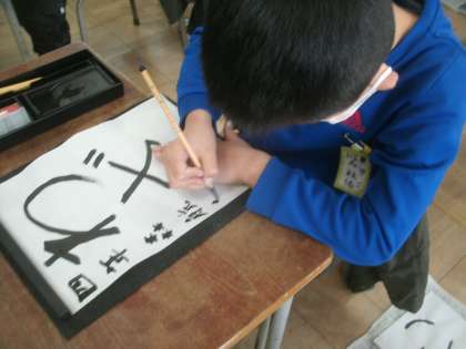 国語科学習の様子です。今日は書写「毛筆」の学習です。「わざ」を書いています。
