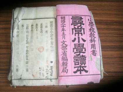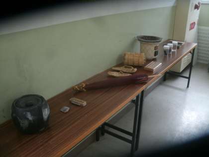 3年生の教室の前に昔の生活道具や教科書が並べられています。