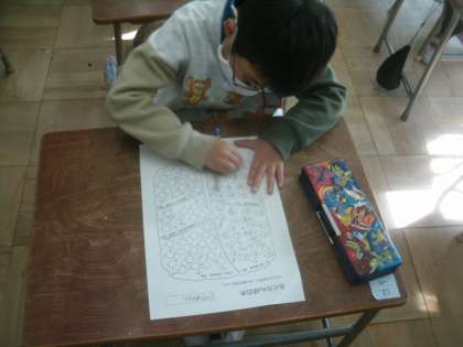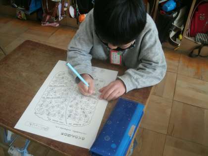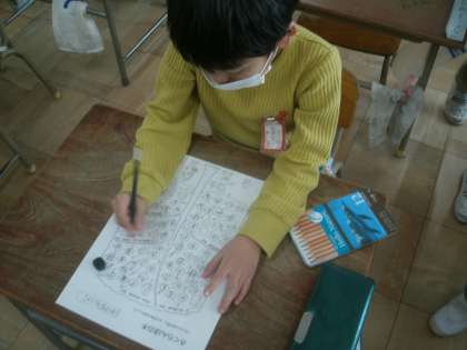 「さくらんぼの木」というプリントを使って1年生で習った漢字の復習をしています。しっかり書けるようになったかな。お家でも確かめてあげてくださいね。1日に10個の漢字を「自学自習ノート」に書かせてあげるだけで立派な家庭学習になりますよ。私の母のようにチラシの裏に書かせるというのもありですね。