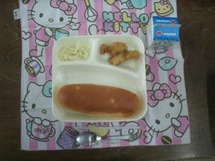 (今日の献立) 白身魚のフリッター 洋風煮 カリフラワーのサラダ おさつパン 牛乳