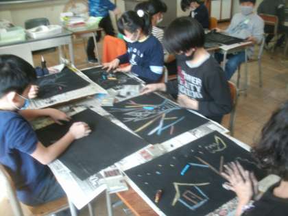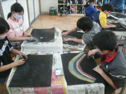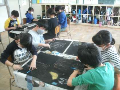 でも、作品に没頭すればするほど手や腕は真っ黒になっていきます。中には服を汚してしまった子どももいるようです。お洗濯の手間を取らせることになると思いますがよろしくお願いいたします。申し訳ありません