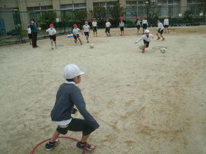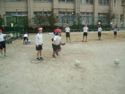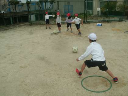 体育科学習の様子です。ベースボール型の「ボールけりゲーム」に取り組んでいます。