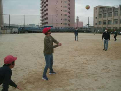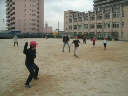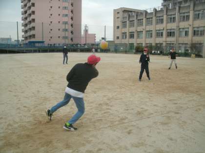 今日から突然始まった6年生の男の子たちのボール遊びはドッジボールを手で打つベースボール型の遊びです。けっこうパワーが必要ですね。