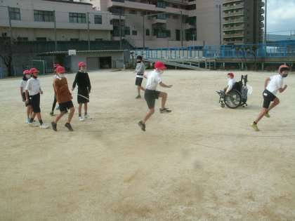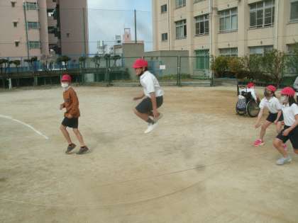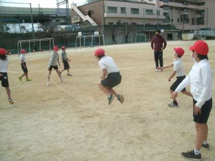 体育科学習の様子です。グループに分かれて「長なわ」に取り組んでいました。