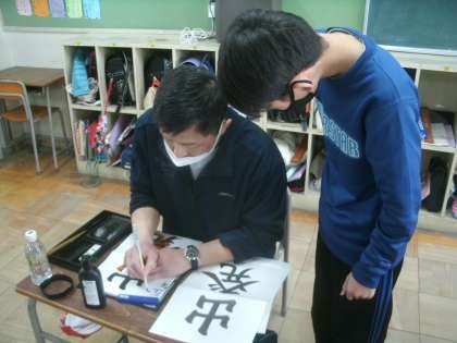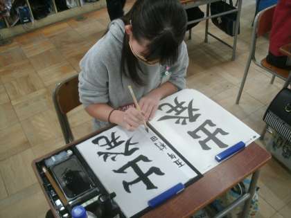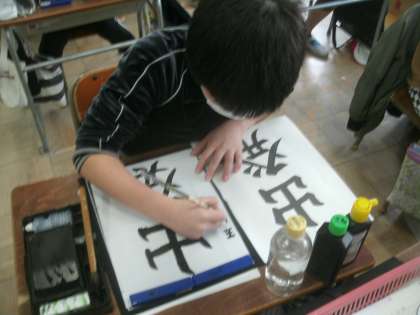 今日は毛筆の学習です。課題は「出発」です。「発」という字のバランスが難しそうですね。