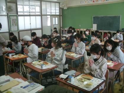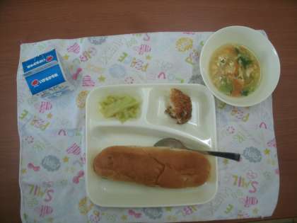 (今日の献立) 中華おこわ 卵スープ キャベツのオイスターソース炒め レーズンパン 牛乳