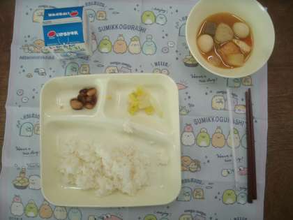 (今日の献立) 関東煮 白菜の甘酢あえ とら豆の煮物 ごはん 牛乳