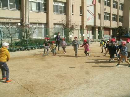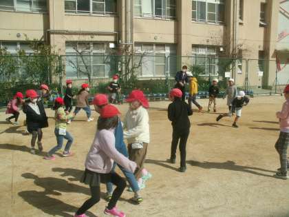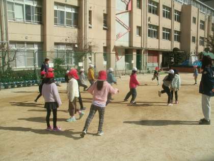 2年生の子ども達が15分休みに「みんなあそび」のドッジボールをしています。