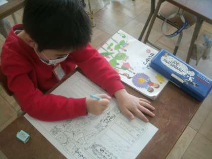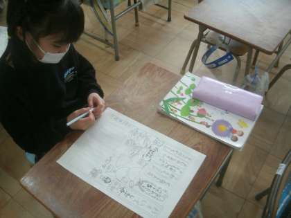 金塚小学校に入学した1年間を振り返り、新聞作りに取り組んでいます。