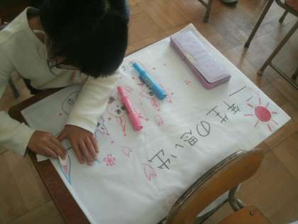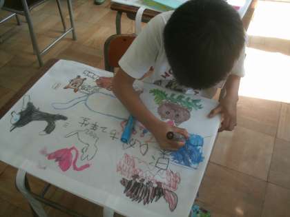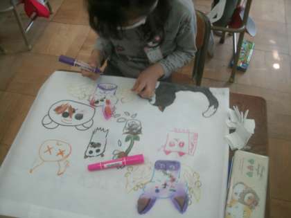 図画工作科の図画を入れる作品袋に可愛い絵を描いています。