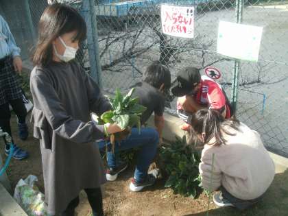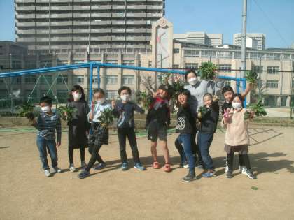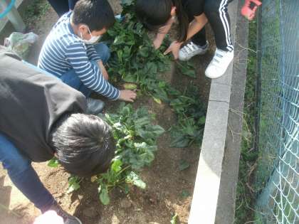 子ども達は収穫したホウレンソウを手にニコニコ笑顔ですね。