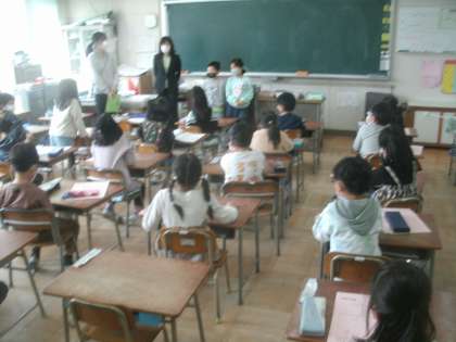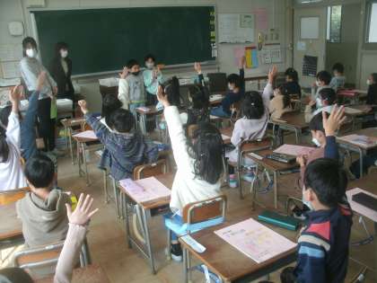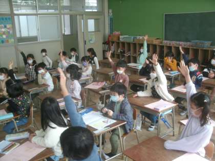 日直当番は「朝の会」の司会をした後にスピーチをします。お友だちから質問の手がたくさん挙がります。