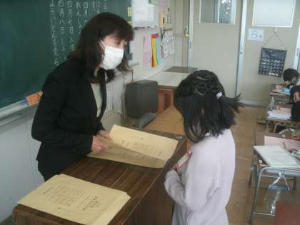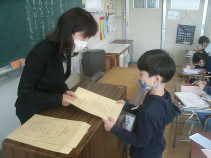 担任の古井先生から子ども達に通知表が手渡されました。一人一人頑張ったことをしっかりほめながら渡しておられました。これは金塚小学校の先生方が全て実践されていることです。金塚小学校は「叱って身に付けさせる指導」から脱却し、「できたグループや子どもをほめて、全体に広げていく指導」を目指しています。お家でもお子さんをしっかりほめてあげてください。
