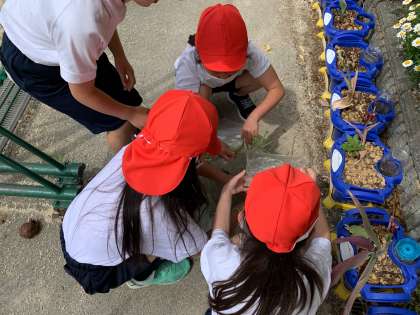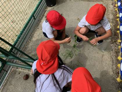 2年生の子どもたちがアブラナの種を集めているときに何か見つけたようです。