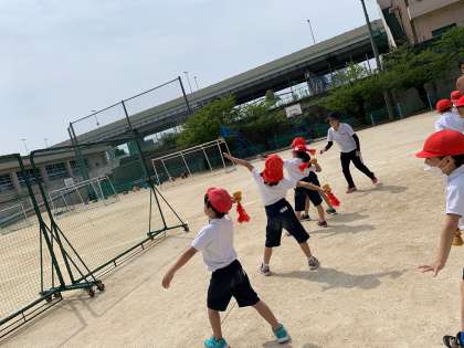 遠くに投げるためには、投げる角度が重要です。そのため、ネット越しに投げて、投げる角度を体感させています。