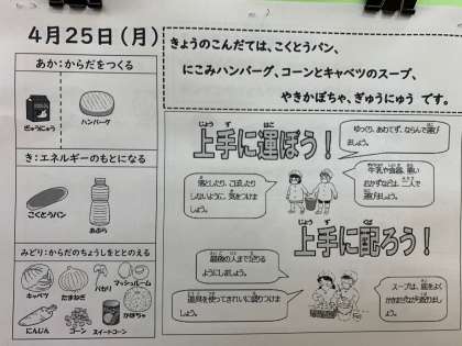 4月25日(月)給食の時間 公開日 2022/04/25 更新日 2022/04/25 お知らせ 煮込みハンバーグは、味がよくしみ込んでいました。コーンとキャベツのスープは、コーンとキャベツの甘みがほどよく感じられおいしかったです。やきかぼちゃは、かぼちゃの甘みがよく出ていました。 いいね(0)