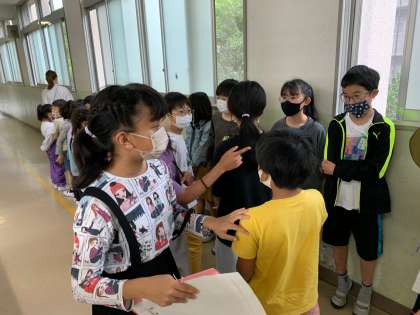 わくわくグループ活動5 高学年の子どもが並び方を決めています。 赤グループ