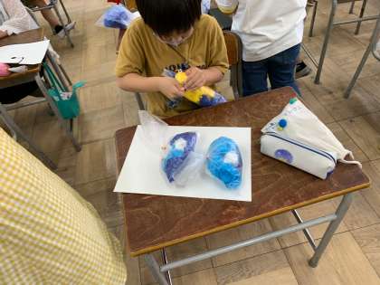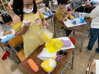 ふくろに花紙を詰めて何か楽しいものを作っていました。