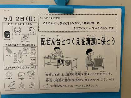 今日の献立は、こくとうパン・ひとくちとんかつ・ミネストローネ・ミニフィッシュ・牛乳です。今日の給食の目標は、エプロンをきれいに使おうです。