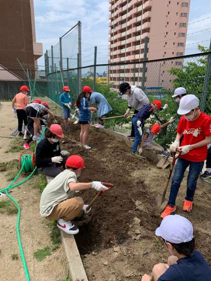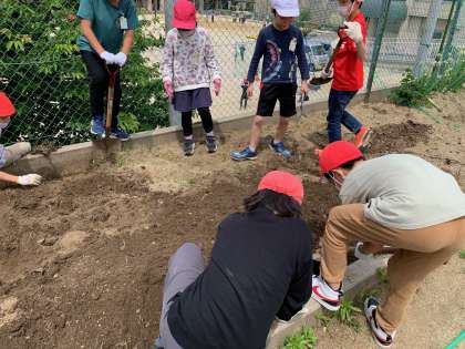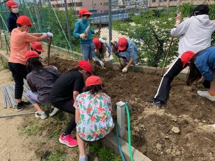 土づくりも終わり、今日はみんなで畝を作りました。 幸い曇っていたので、仕事がはかどりました。