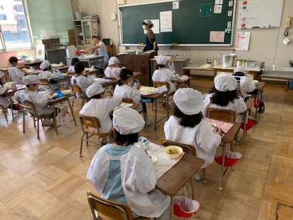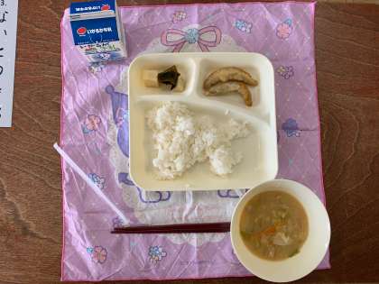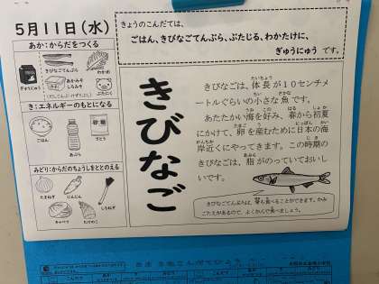 今日の献立は、ごはん、きびなごてんぷら、ぶたじる、わかたけに、ぎゅうにゅうです。
